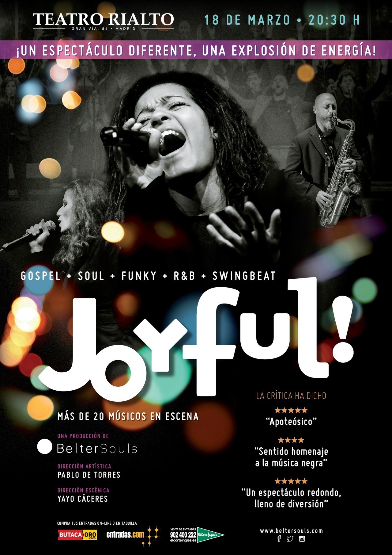 El 18 de marzo el teatro RIALTO de la Gran Vía de Madrid recibió JOYFUL!, una novedosa producción musical que reúne a más de 20 músicos y cantantes en escena y que fusiona la fuerza de un concierto de góspel con una espectacular puesta en escena y una divertida dramaturgia.